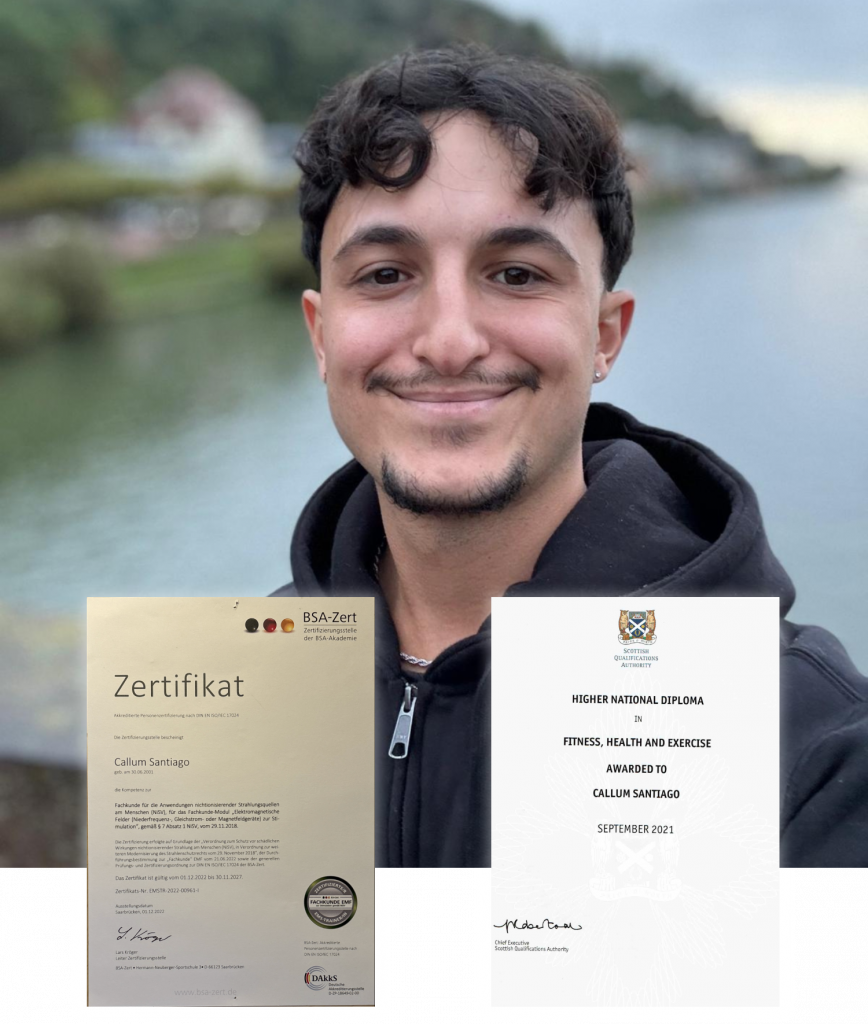 Callum Santiago ist ein junger Unternehmer und EMS-Experte mit internationalem Hintergrund und umfangreicher Erfahrung in der Fitnessbranche. Nach einem Studium im Bereich “Fitness, Health and Exercise” in Edinburgh und mehreren Jahren als Studioleiter und EMS-Trainer entschied sich Callum, ein innovatives Konzept für mobiles EMS-Training in Heidelberg zu entwickeln. Er bietet seinen Kunden maßgeschneiderte, zeit- und ortsunabhängige Trainingseinheiten direkt zu Hause an. Seine Leidenschaft für Fitness und der Wunsch, Menschen effizient und flexibel zu ihren Zielen zu führen, prägen seine Arbeit. Wer Callum wählt, erhält nicht nur Fachwissen, sondern auch persönliche, engagierte Betreuung.